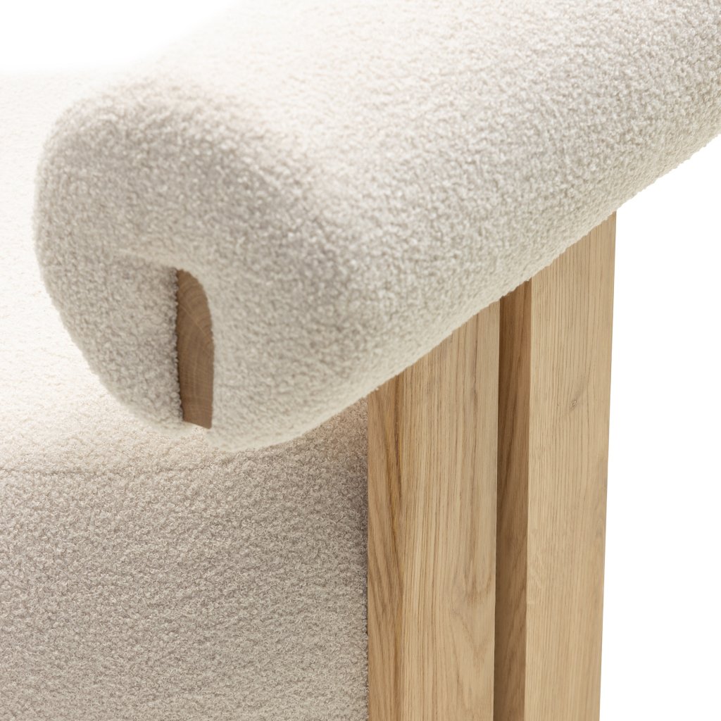 Látka Bouclé je aktuálny interiérový trend, ktorý je mäkký, hrejivý a vizuálne zaujímavý. Je to jemná, štruktúrovaná látka príjemná na dotyk. Drevená podstava zaručuje celkovú stabilitu a pevnosť kresla.