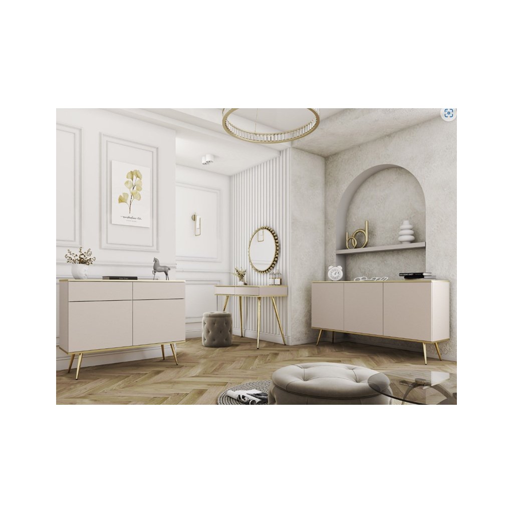 Dizajnový toaletný stolík BIJOU T-102 v jemnej béžovej farbe v kombinácii so zlatými vysokými nohami pôsobí elegantne a nadčasovo. Táto štýlová kombinácia sa dokonale hodí k rôznym farebným aj dizajnovým prevedeniam interiéru. Stolík disponuje dvomi priestrannými zásuvkami, ktoré ponúkajú dostatok miesta na uloženie kozmetiky, doplnkov či osobných predmetov. Vneste do svojej spálne alebo študentskej izby nádych luxusu a harmónie s týmto vkusným a praktickým kúskom nábytku.