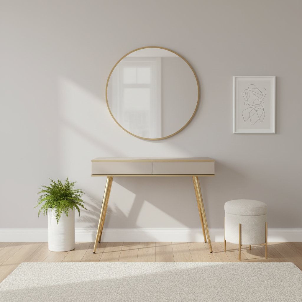 Toaletný stolík BIJOU T-102 | béžová / zlaté nohy je vyrobený z kvalitných materiálov v kombinácii s MDF doskou, čo zaručuje jeho pevnosť, odolnosť a dlhú životnosť. Stabilitu zabezpečujú vysoké a pevné nohy, ktoré zároveň umožňujú pohodlné používanie robotického vysávača. Stolík je vybavený moderným systémom otvárania Push-to-open a zásuvkami s guľôčkovými klzákmi a plným výsuvom, ktoré poskytujú pohodlný prístup k uloženým veciam. Povrch stolíka je nenáročný na údržbu, vďaka čomu sa ľahko čistí a pomáha udržiavať váš interiér vždy upravený a elegantný.