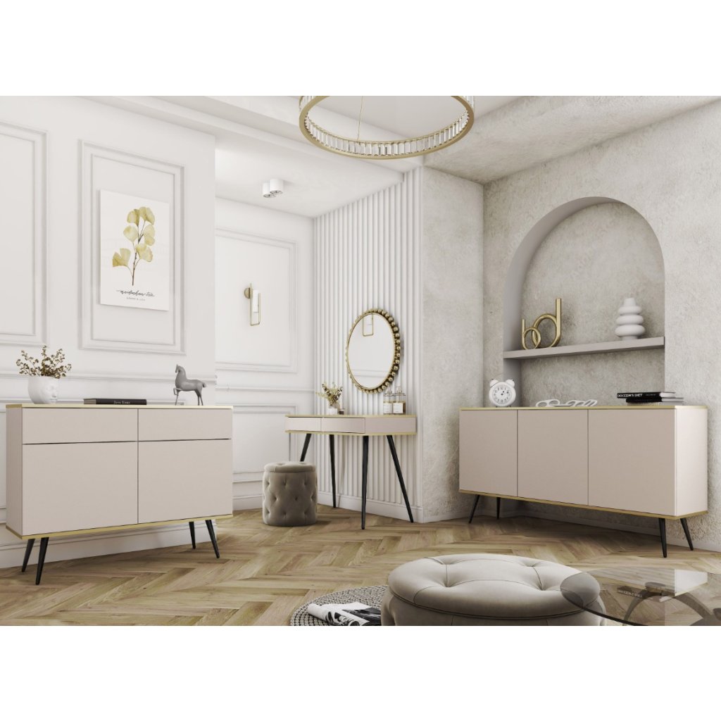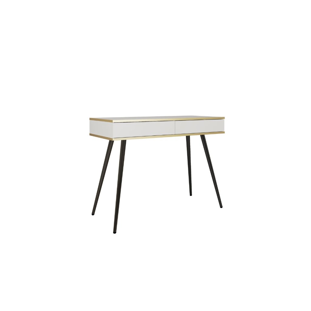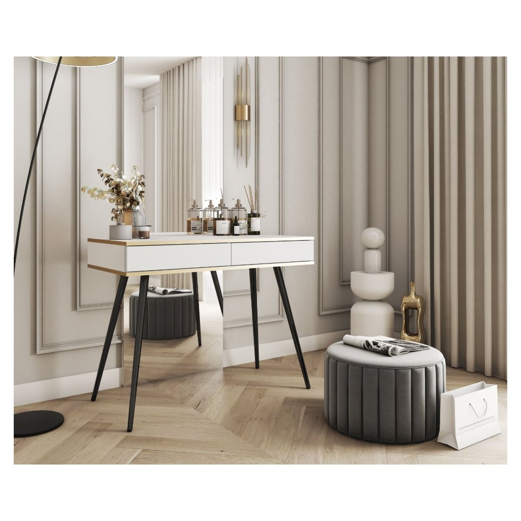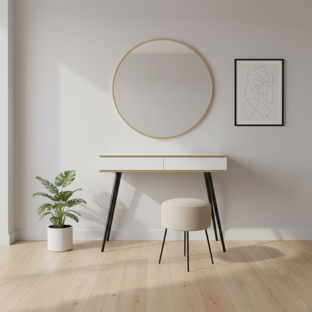 Štýlový toaletný stolík BIJOU T-102 v bielom prevedení s kombináciou čiernych nôh a zlatých detailov pôsobí elegantne a nadčasovo. Táto moderná farebná kombinácia sa výborne hodí k rôznym štýlom a farebným odtieňom interiéru. Stolík je vybavený dvomi priestrannými zásuvkami, ktoré poskytujú dostatok miesta na uloženie kozmetiky, doplnkov či osobných vecí. Vneste do svojej spálne alebo študentskej izby štýl, harmóniu a jemný dotyk elegancie s týmto krásnym kúskom nábytku.