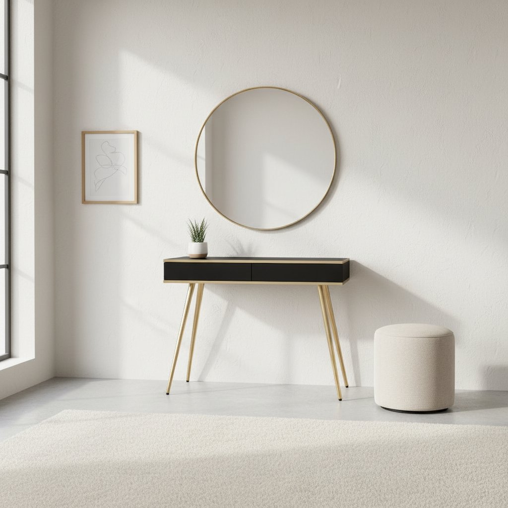 Toaletný stolík BIJOU T-102 | čierna / zlaté nohy je vyrobený z kvalitných materiálov v kombinácii s MDF doskou, čo zaručuje jeho pevnosť, odolnosť a dlhú životnosť. Stabilitu zabezpečujú vysoké a pevné nohy, ktoré zároveň umožňujú pohodlné používanie robotického vysávača. Stolík je vybavený moderným systémom otvárania Push-to-open a zásuvkami s guľôčkovými klzákmi a plným výsuvom, ktoré poskytujú pohodlný prístup k uloženým veciam. Povrch stolíka je nenáročný na údržbu, vďaka čomu sa ľahko čistí a pomáha udržiavať váš interiér vždy upravený a elegantný.