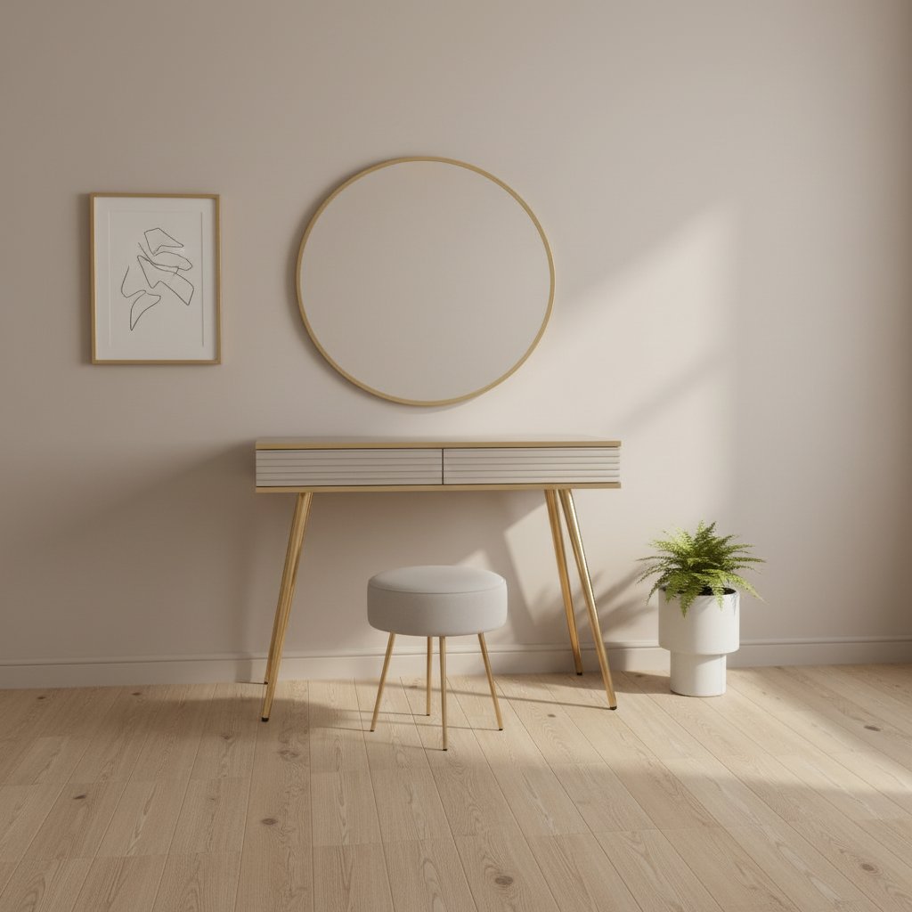 Toaletný stolík BIJOU T-102 MDF | béžová / zlaté nohy je vyrobený z kvalitných materiálov v kombinácii s MDF doskou, čo zaručuje jeho pevnosť, odolnosť a dlhú životnosť. Stabilitu zabezpečujú vysoké a pevné nohy, ktoré zároveň umožňujú pohodlné používanie robotického vysávača. Stolík je vybavený moderným systémom otvárania Push-to-open a zásuvkami s guľôčkovými klzákmi a plným výsuvom, ktoré poskytujú pohodlný prístup k uloženým veciam. Povrch stolíka je nenáročný na údržbu, vďaka čomu sa ľahko čistí a pomáha udržiavať váš interiér vždy upravený a elegantný.