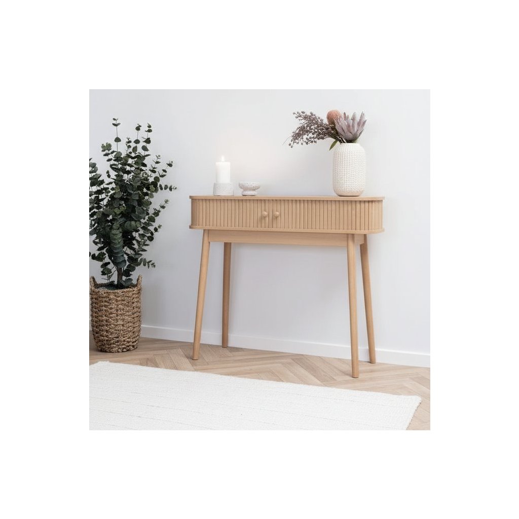 Elegantný toaletný stolík v prírodnom drevenom dekore pôsobí jemne a nadčasovo. Vďaka zaobleným tvarom a vertikálnemu frézovaniu na prednej časti zásuvky pôsobí ľahko a zároveň veľmi štýlovo. Praktická zásuvka poskytuje priestor na uloženie drobností, kozmetiky či doplnkov. Stolík stojí na pevných drevených nohách, ktoré mu dodávajú stabilitu aj vizuálnu ľahkosť. Krásne vynikne v spálni alebo predsieni v škandinávskom či modernom štýle.