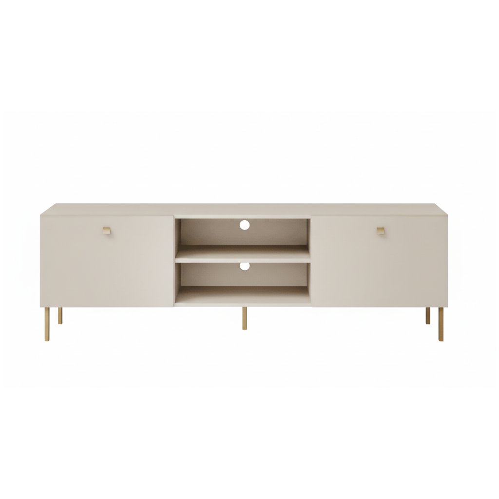 Elegantný TV stolík KISS vo farbe kašmír predstavuje spojenie moderného minimalizmu a jemných zlatých akcentov, ktoré okamžite povýšia úroveň vášho interiéru. Je navrhnutý pre tých, ktorí chcú svojim priestorom dopriať štýl, čisté línie a maximálnu funkčnosť. Jemná krémová farba v kombinácii so zlatými nohami a úchytkami vytvára harmonický a nadčasový vzhľad typický pre luxusné interiéry. Vneste do svojho domova harmóniu, estetiku a prémiovú atmosféru, ktorú si zaslúžite.