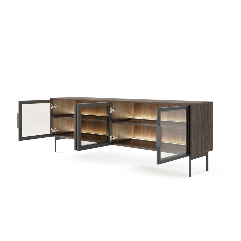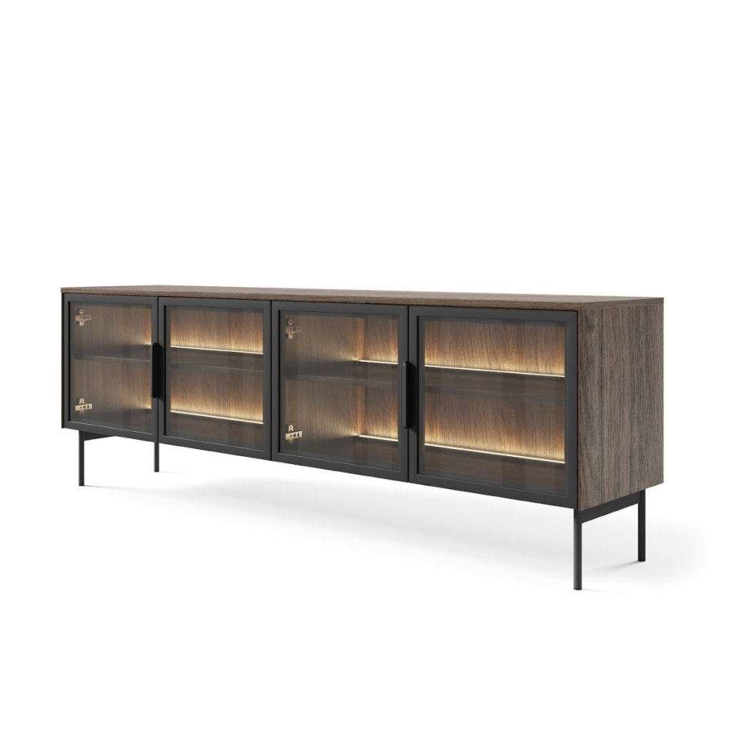 TV stolík NAIRE 4D je štýlovým doplnkom moderného interiéru, ktorý vyniká elegantným a nadčasovým dizajnom. Tmavé farebné prevedenie dub dunin v kombinácii s čiernymi úchytkami a vysokými nohami v rovnakej farbe pôsobí ľahko, vzdušne a harmonicky. Súčasťou stolíka je integrované LED osvetlenie v príjemnej teplej bielej farbe, ktoré podčiarkuje jeho moderný charakter a dodáva priestoru útulnú atmosféru.