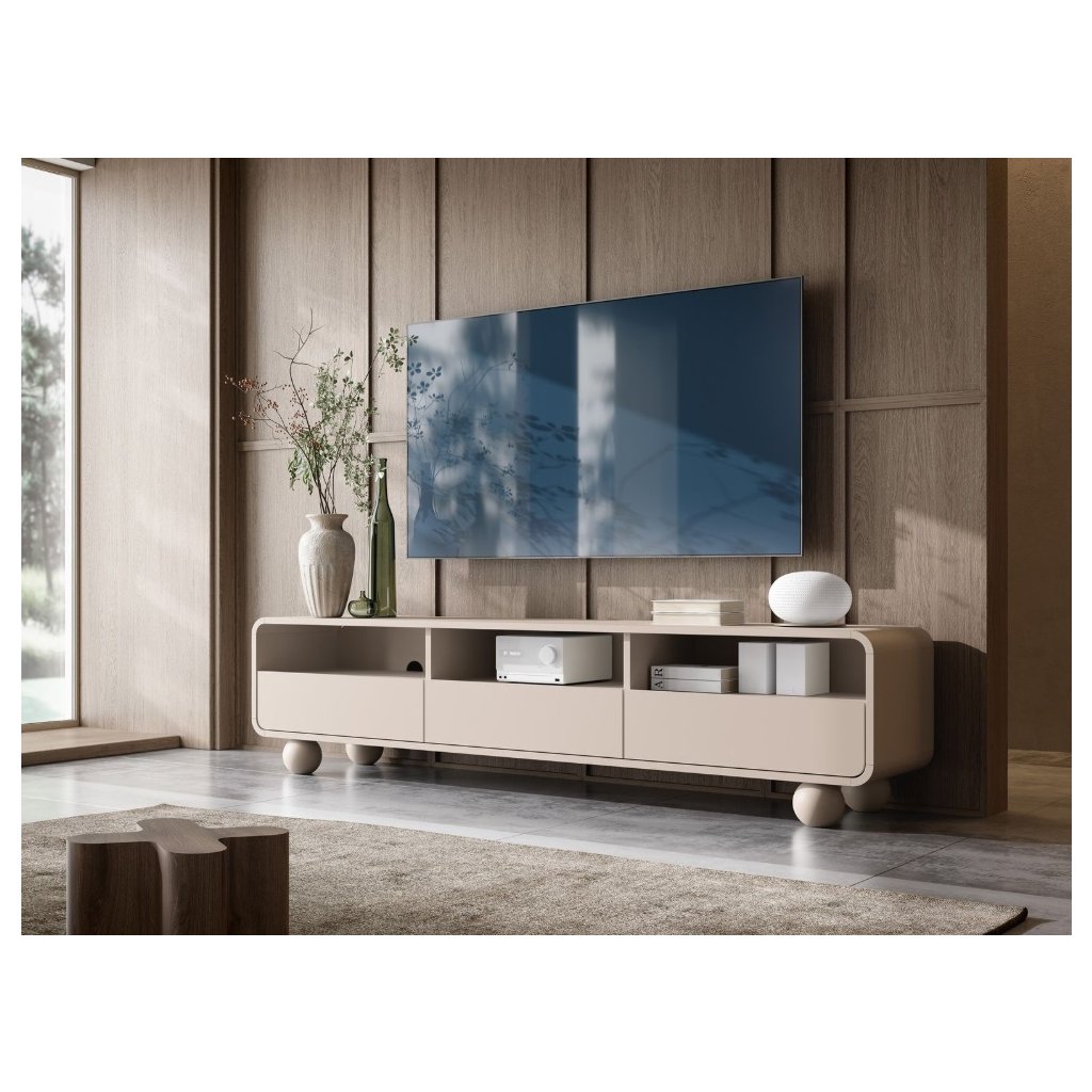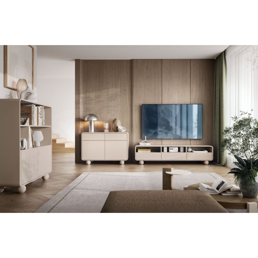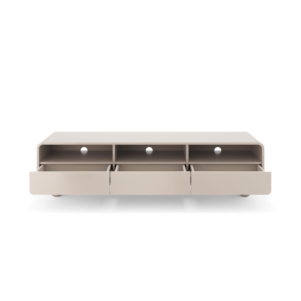 TV stolík NIBAL RTV180 zaujme svojimi jemne zaoblenými tvarmi, ktoré pôsobia elegantne, moderne a nadčasovo. Precízne zakrivené hrany dodávajú nábytku harmonický vzhľad, pričom zároveň zvyšujú bezpečnosť a komfort pri každodennom používaní. Charakteristickým dizajnovým prvkom sú guľaté nožičky, ktoré pôsobia ľahko a štýlovo, čím dodávajú stolíku jemný vizuálny akcent. Povrch v odtieni cashmere pôsobí útulne a sofistikovane, vďaka čomu TV stolík bez problémov zapadne do moderných aj klasických interiérov. Hladké plochy bez úchytiek podčiarkujú minimalistický charakter kolekcie, zatiaľ čo systém push-to-open umožňuje pohodlné otváranie zásuviek a dvierok jemným zatlačením, bez potreby klasických úchytiek. TV stolík je priestranný a prakticky riešený, ponúka otvorené police a tri zásuvky, ktoré poskytujú dostatok úložného priestoru pre elektroniku či doplnky. Praktickým prvkom sú aj tri otvory na káble, ktoré umožňujú prehľadné a estetické usporiadanie techniky.