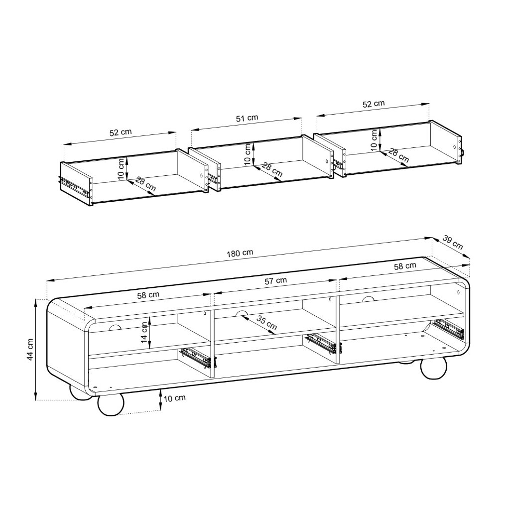 TV stolík NIBAL RTV180 je vyrobený z kvalitných a odolných materiálov, ktoré zabezpečujú pevnosť, stabilitu a dlhú životnosť nábytku. Zásuvky sú vybavené guľôčkovými vodiacimi lištami s plným výsuvom, čo zaručuje plynulé a tiché otváranie aj zatváranie. Otváranie dvierok a zásuviek je riešené moderným systémom push-to-open, ktorý umožňuje jednoduché používanie jemným zatlačením, bez potreby klasických úchytiek. Údržba je rýchla a nenáročná – odporúča sa používať mäkkú handričku a vhodný čistiaci prostriedok na nábytok, aby si TV stolík zachoval svoj elegantný vzhľad a dokonalý povrch.