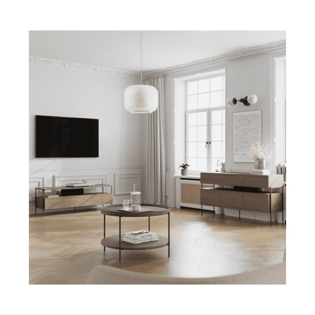 Dizajnový TV stolík PUFFIN z dubovej dýhy spája prírodnú eleganciu dreva s čistým, moderným dizajnom. Jemná kresba dubu v hnedom prírodnom odtieni dodáva obývačke útulnú atmosféru a vytvára harmonický kontrast k moderným technológiám. Vďaka minimalistickým líniám pôsobí stolík nadčasovo a ľahko zapadne do rôznych štýlov interiéru. Povrch z kvalitnej dubovej dýhy zvýrazňuje prirodzený charakter dreva a zároveň zabezpečuje vysokú odolnosť pri každodennom používaní. Stabilná konštrukcia doplnená o jemné kovové nohy dodáva TV stolíku vzdušnosť a vizuálnu ľahkosť, bez narušenia funkčnosti.