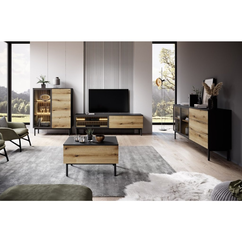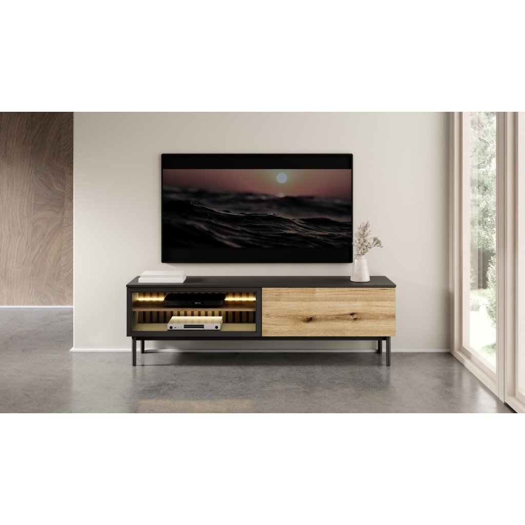 TV stolík TONG 150 2D spája prírodný dub s elegantnou čiernou farbou, ktorú podčiarkuje teplé LED osvetlenie a lamely umiestnené za tónovaným sklom – spolu vytvárajú príjemnú, útulnú atmosféru. Namiesto tradičných rukovätí je vybavený moderným systémom push-to-open, ktorý umožňuje pohodlné otváranie dotykom. Tento štýlový TV stolík je určený pre tých, ktorí si potrpia na originálny dizajn, funkčnosť a jedinečný charakter interiéru.