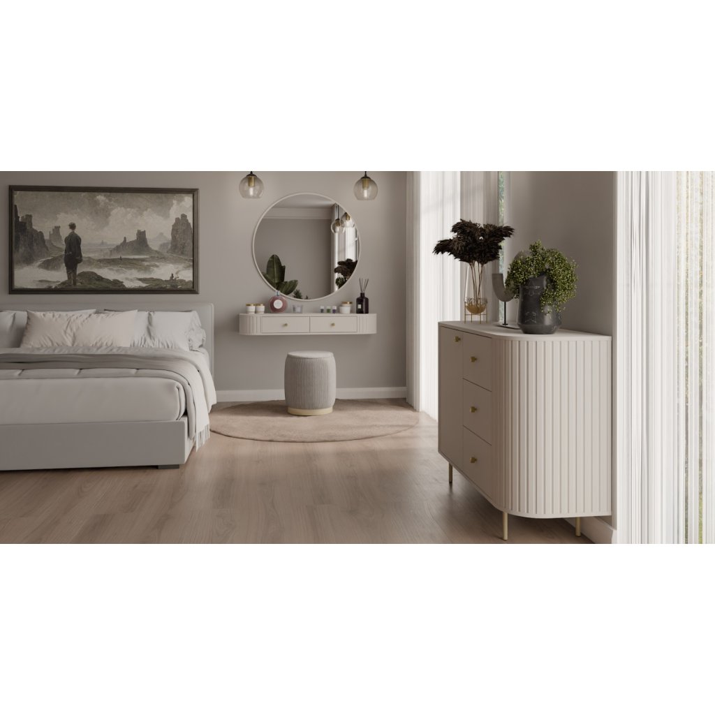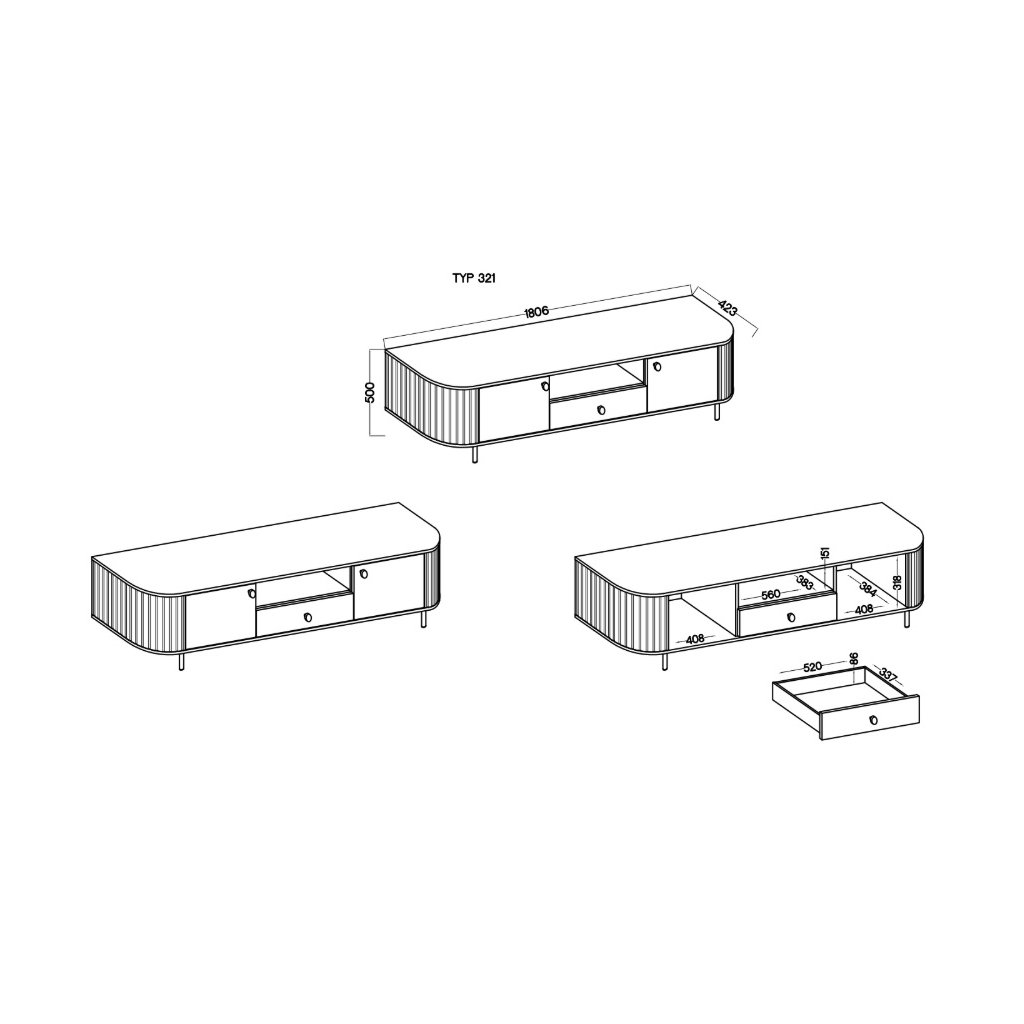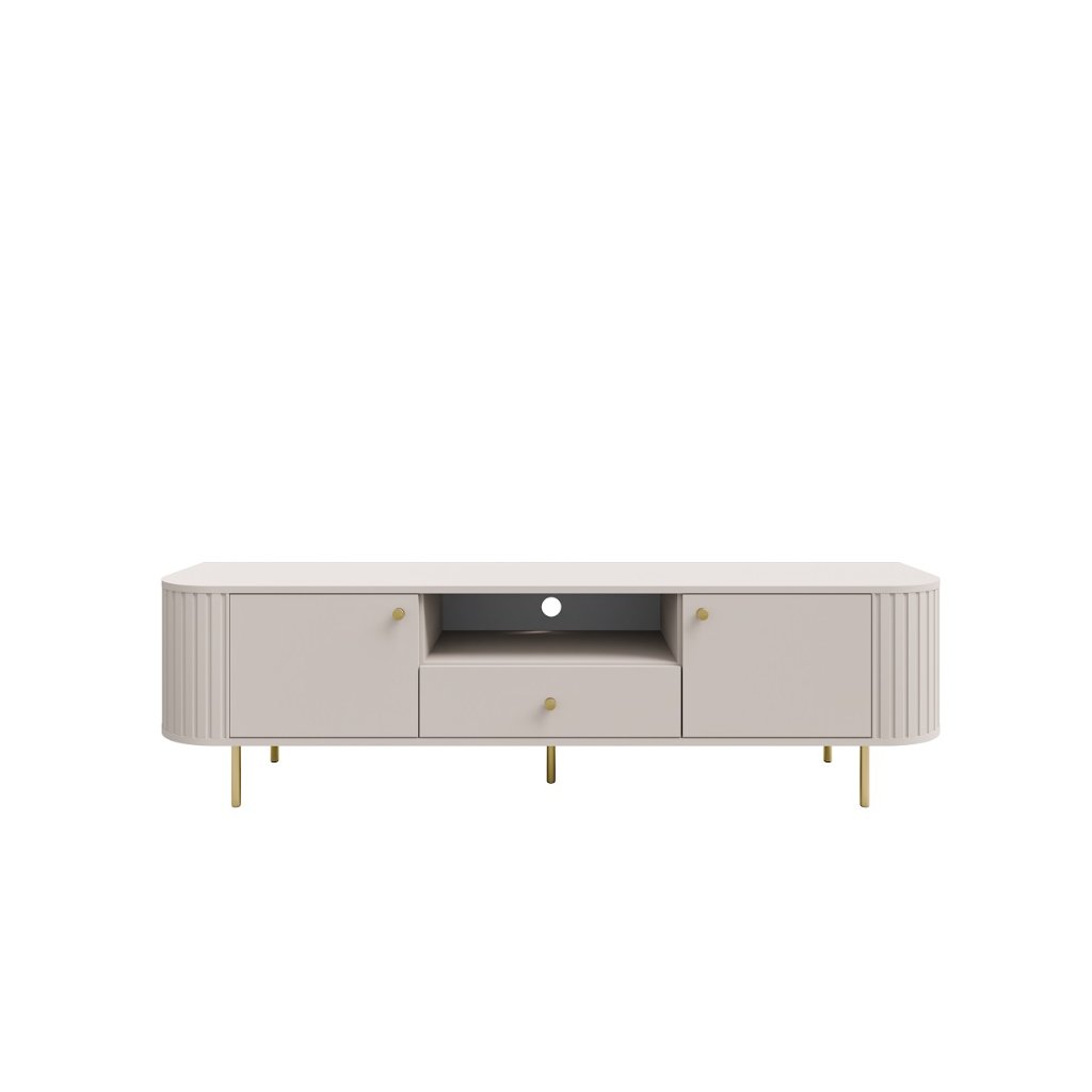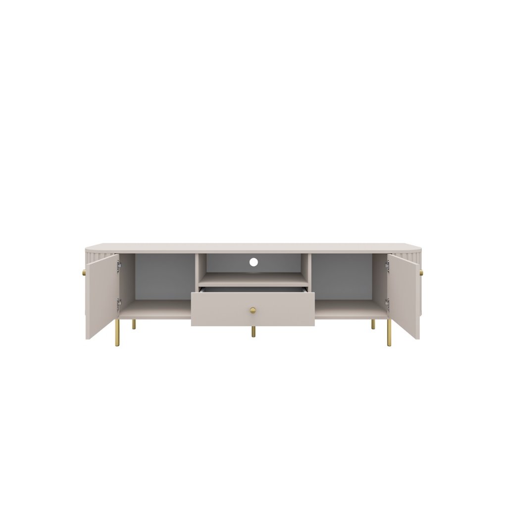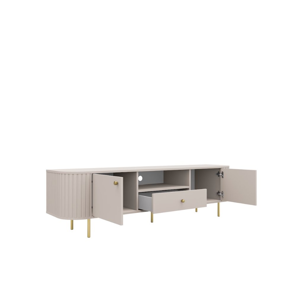 Kolekcia VAOLIA prináša minimalistický štýl doplnený o precízne frézované detaily, ktoré dodávajú interiéru jemnú eleganciu a moderný výraz. Tlmené, zemité odtiene pieskovo béžovej farby sú harmonicky oživené zlatými akcentmi, ktoré vytvárajú decentný kontrast so svetlou paletou. TV stolík VAOLIA 2F1S ponúka kombináciu dvoch dvierok, praktickej zásuvky a otvorenej poličky, čo z neho robí funkčný kus nábytku pre usporiadanie elektroniky či doplnkov. Súčasťou je aj praktický otvor na káble, vďaka ktorému zostane priestor pôsobivo uprataný. Kovové nohy a úchytky v zlatom prevedení dodávajú stolíku ľahký, vzdušný vzhľad, bez toho aby ho opticky zaťažili, a zároveň podčiarkujú jeho elegantný charakter.