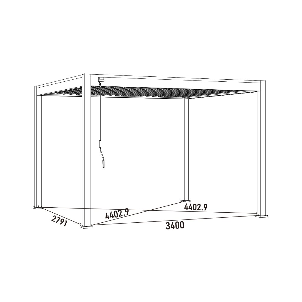 Bioklimatická pergola INTRO NEO disponuje 23 nastaviteľnými otočnými lamelami, ktoré zabezpečujú spoľahlivú ochranu pred slnkom aj dažďom. Ich sklon je možné plynulo regulovať od 0° (úplne uzavretá strecha) až po 135°, vďaka čomu si jednoducho prispôsobíte úroveň tienenia podľa aktuálnych potrieb. Manuálne ovládanie pomocou kľučky je navrhnuté pre hladkú a bezpečnú manipuláciu bez rizika poškriabania konštrukcie. Kľučka je zároveň umiestnená tak, aby neprekážala pri prípadnom doplnení pergoly o bočné zásteny alebo panely.