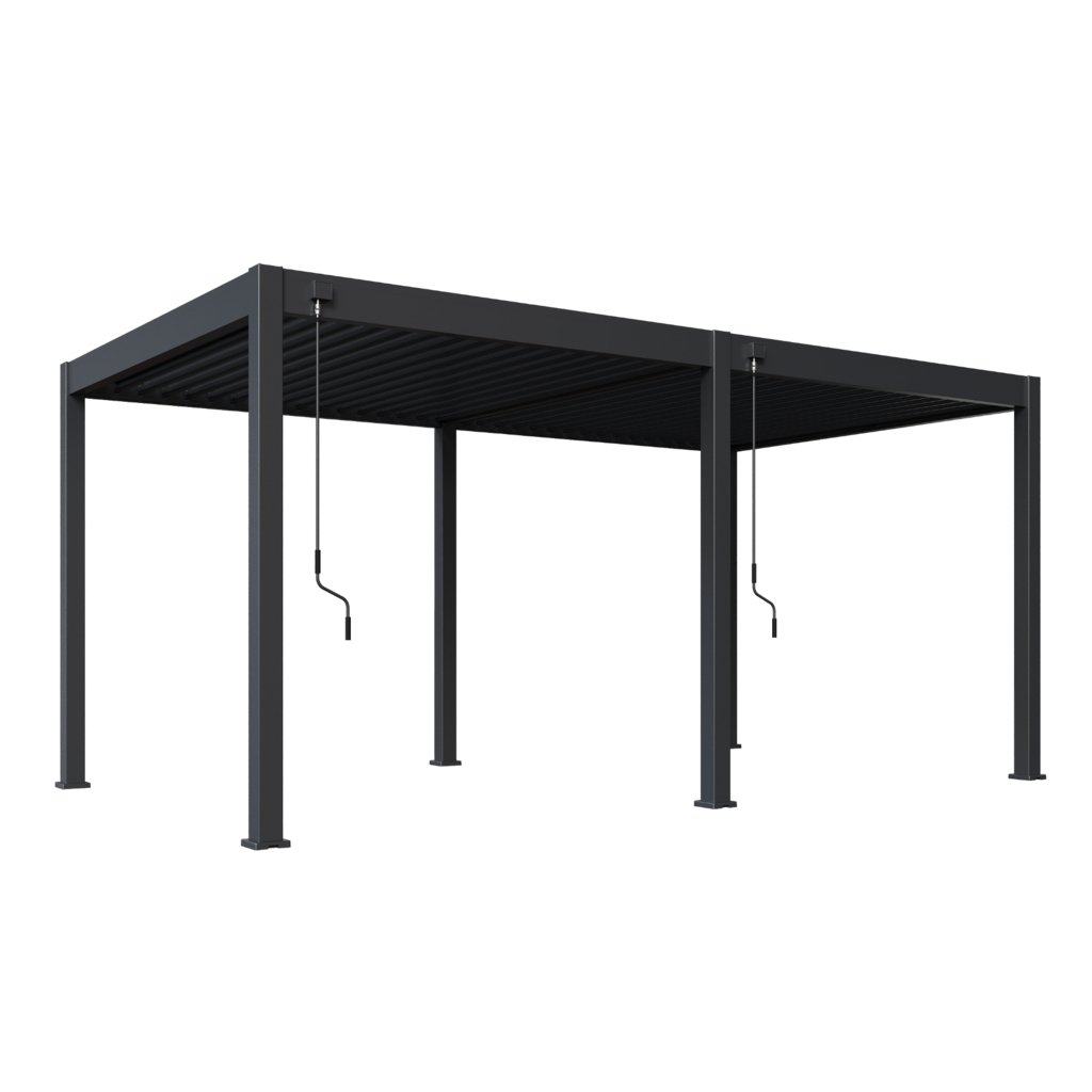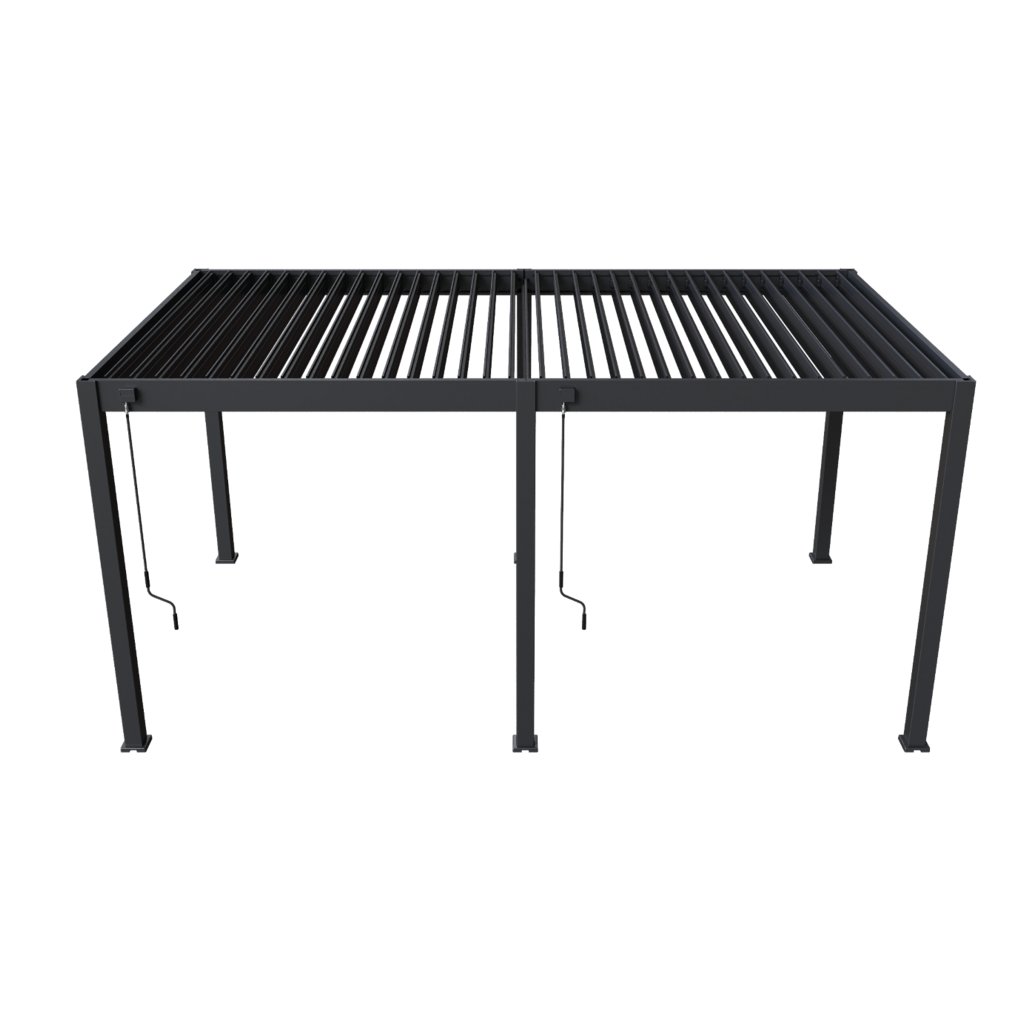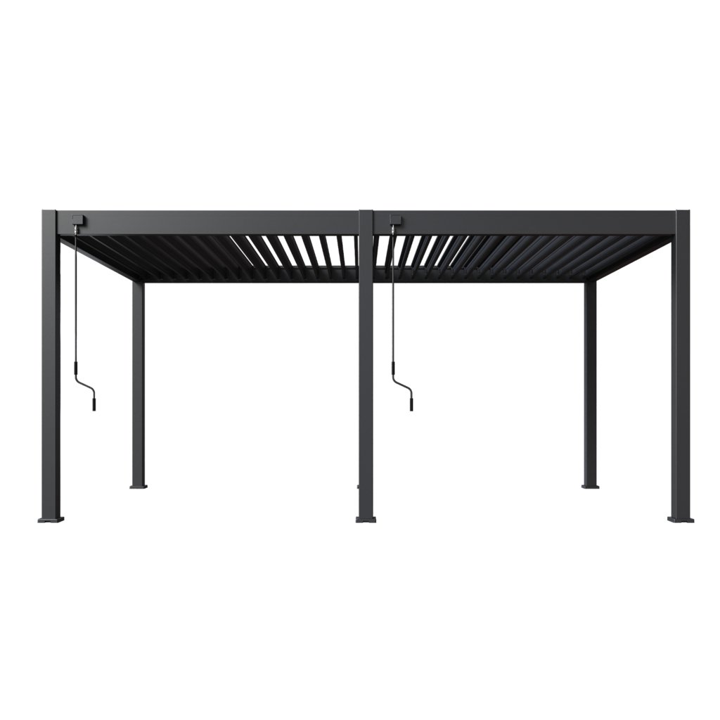 Pergola je vybavená 34 nastaviteľnými otočnými lamelami, ktoré poskytujú účinnú ochranu pred slnkom aj dažďom. Ich sklon je možné plynule regulovať v rozsahu od 0° do 135°, čo umožňuje úplné uzavretie strechy alebo prispôsobenie tienenia podľa aktuálnych podmienok. Manuálne ovládanie pomocou kľučky je navrhnuté pre jednoduchú a plynulú manipuláciu. Kľučka je umiestnená tak, aby neprekážala pri použití bočných zásten či panelov a umožnila ich pohodlné používanie.