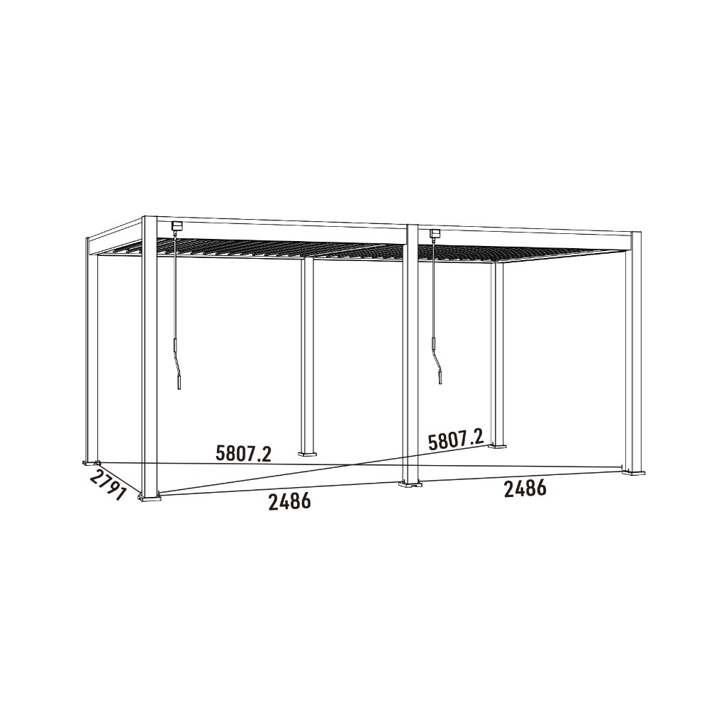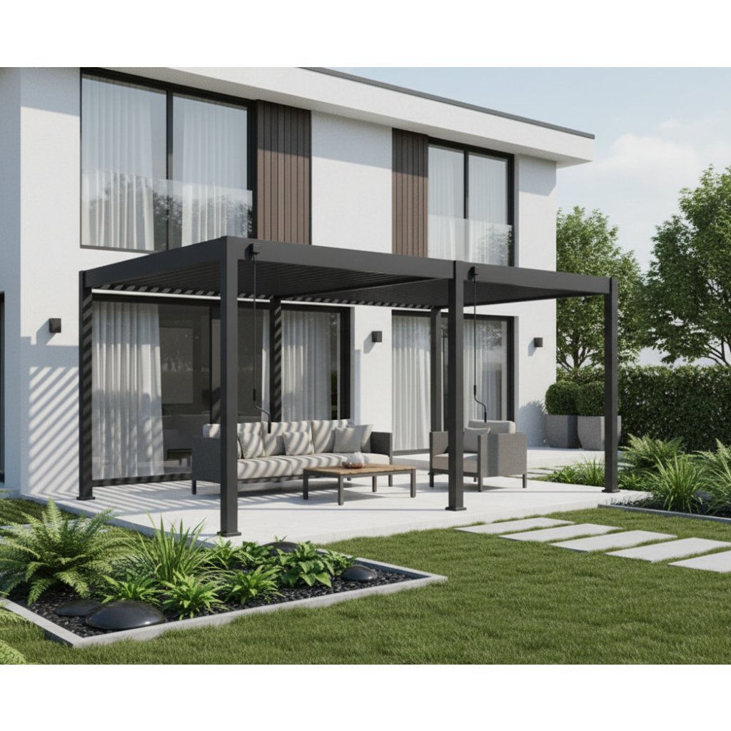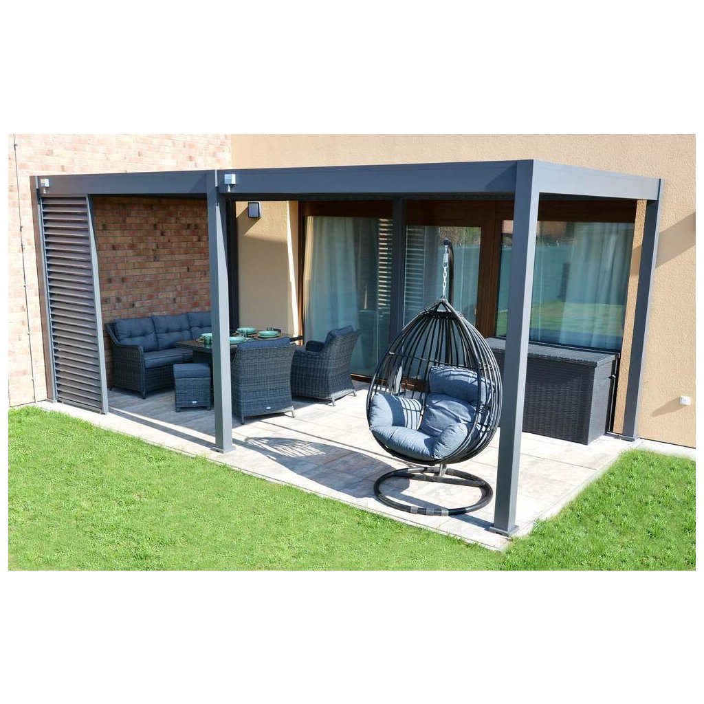 Pergola je vybavená 34 nastaviteľnými otočnými lamelami, ktoré poskytujú účinnú ochranu pred slnkom aj dažďom. Ich sklon je možné plynule regulovať v rozsahu od 0° do 135°, čo umožňuje úplné uzavretie strechy alebo prispôsobenie tienenia podľa aktuálnych podmienok. Manuálne ovládanie pomocou kľučky je navrhnuté pre jednoduchú a plynulú manipuláciu. Kľučka je umiestnená tak, aby neprekážala pri použití bočných zásten či panelov a umožnila ich pohodlné používanie.