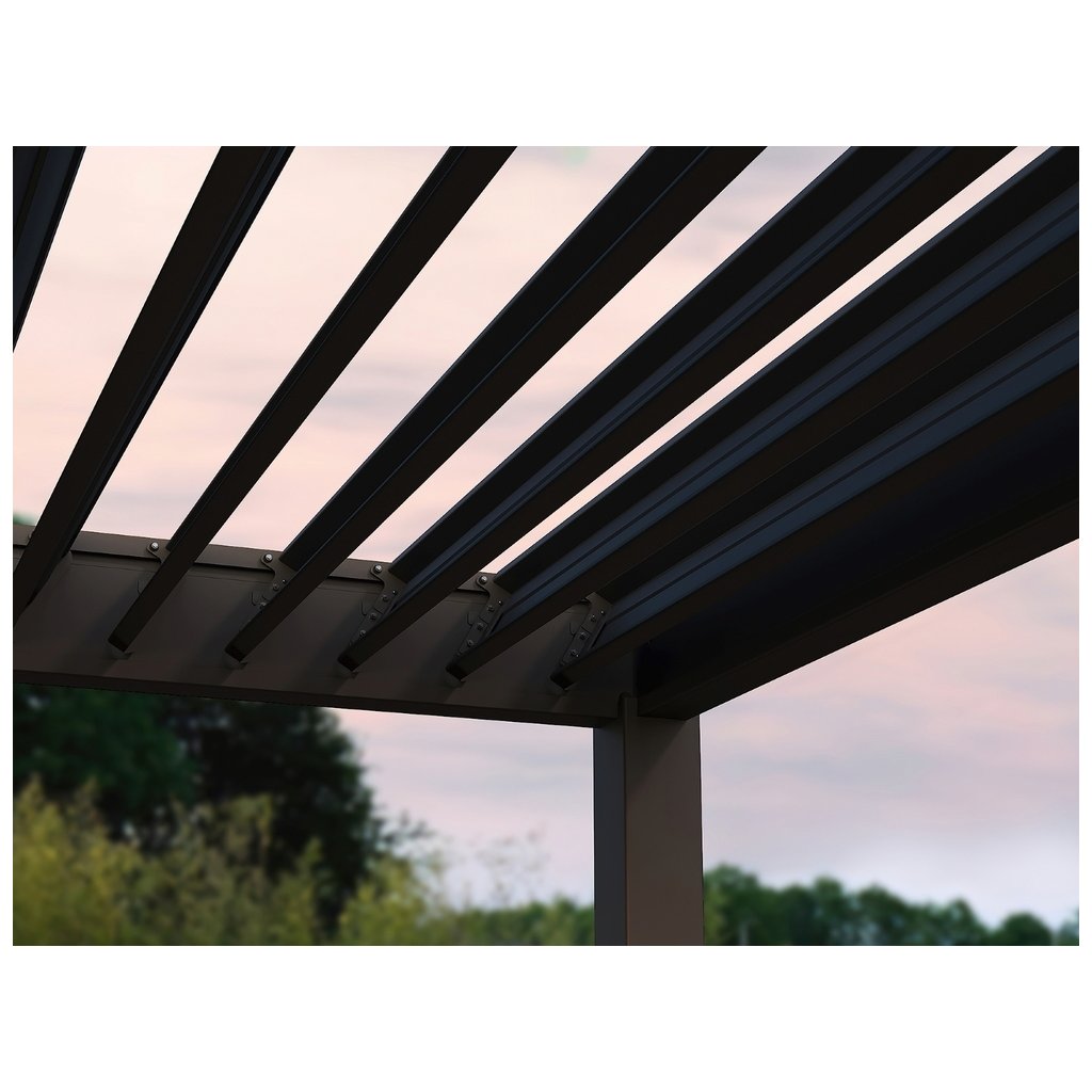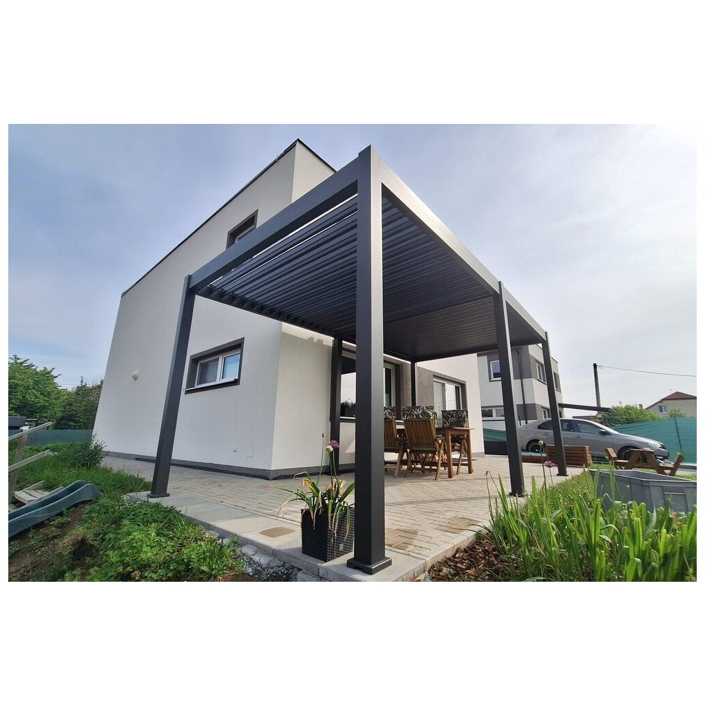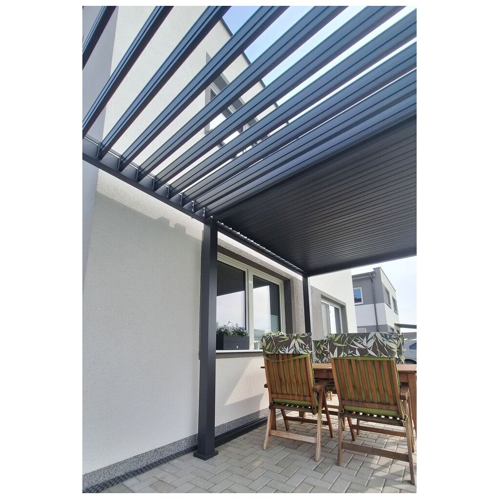 Moderná a odolná bioklimatická pergola INTRO NEO v rozmere 5,3 × 3 m je ideálnym riešením pre vašu terasu či záhradu. Vďaka kvalitným materiálom a prepracovanému dizajnu poskytuje spoľahlivé zastrešenie aj ochranu pred nepriaznivým počasím. Pevná a stabilná hliníková konštrukcia v elegantnej antracitovej farbe RAL 7016 s práškovou povrchovou úpravou zaručuje dlhú životnosť a vysokú odolnosť voči poveternostným vplyvom. Strešné lamely umožňujú reguláciu svetla a vetrania, pričom ich povrchová úprava zabezpečuje zvýšenú ochranu proti korózii. Pergola je voľne stojaca, takže nie je potrebné vŕtať do steny a môžete ju umiestniť presne tam, kde ju potrebujete. Vytvorte si pohodlné a luxusné vonkajšie posedenie s pergolou, ktorá spája moderný vzhľad s maximálnym komfortom.