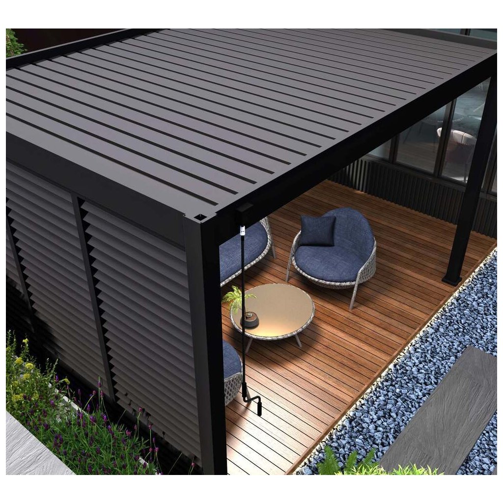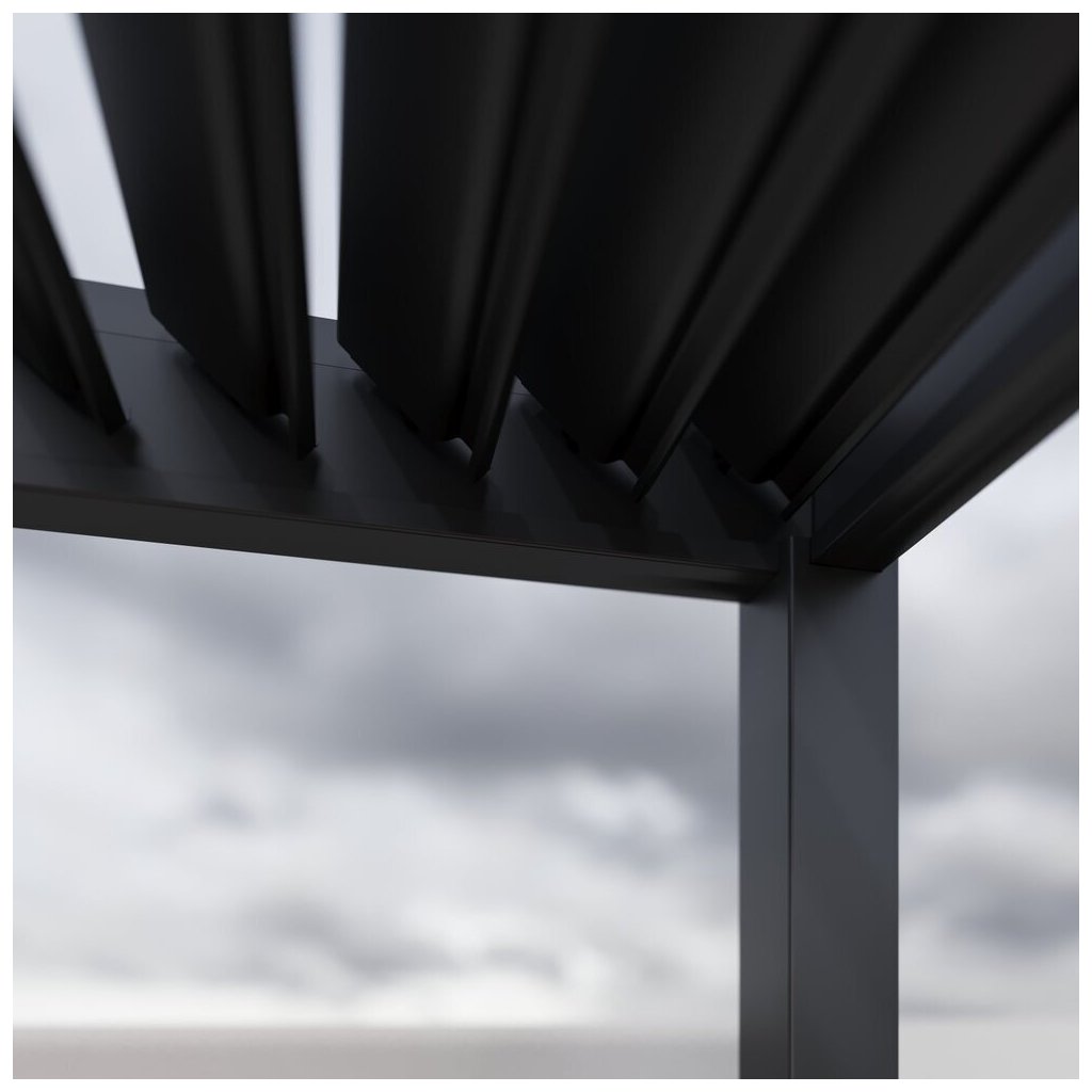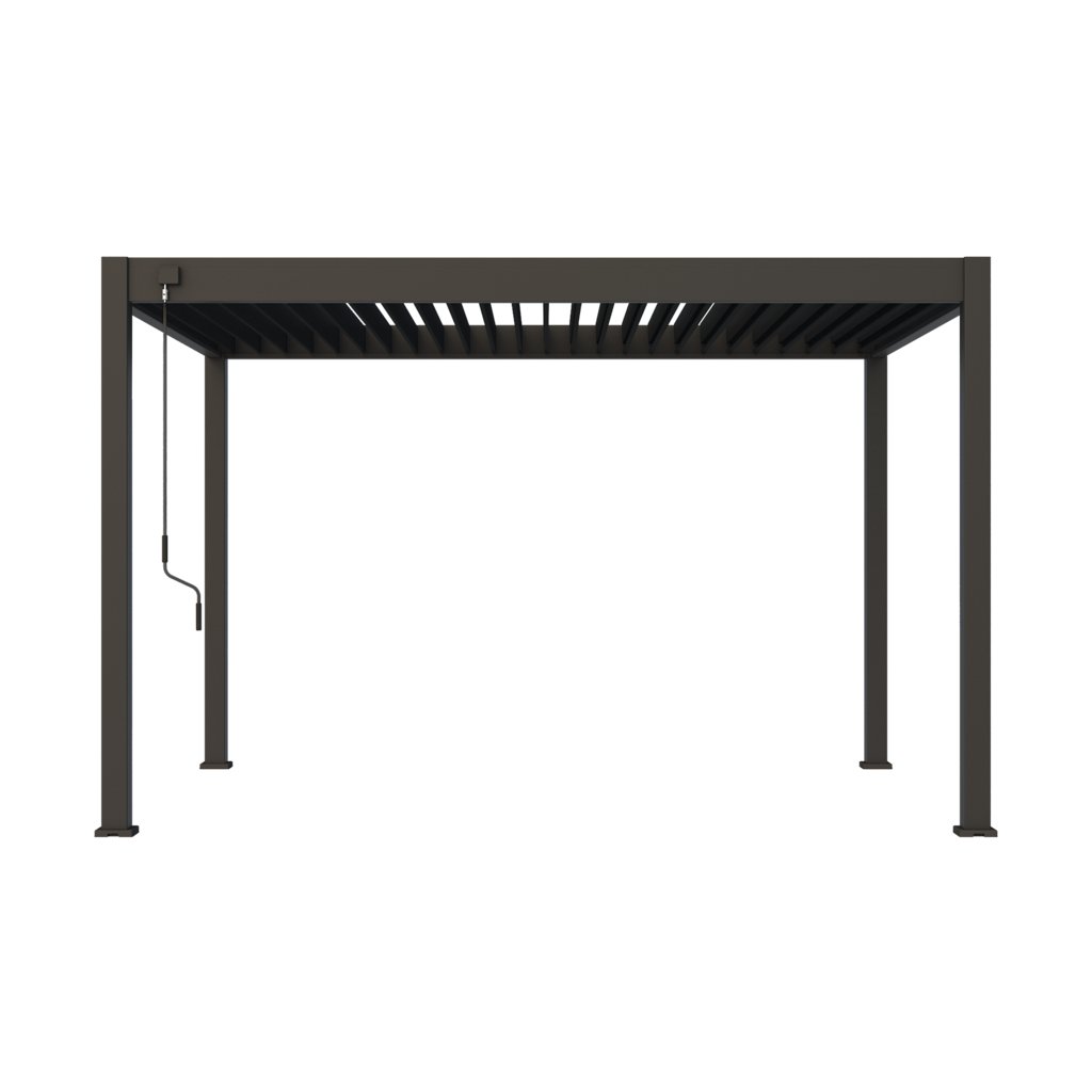 Pergola je vybavená 25 nastaviteľnými otočnými dvojitými lamelami s dutým vnútrom, ktoré poskytujú účinnú ochranu pred slnkom aj dažďom. Ich sklon je možné plynulo nastaviť v rozsahu od 0° do 135°, čo umožňuje úplné uzavretie strechy alebo flexibilné nastavenie tieňa podľa aktuálnych podmienok. Manuálne ovládanie pomocou kľučky je navrhnuté tak, aby umožňovalo jednoduché a plynulé nakláňanie lamiel bez rizika poškriabania konštrukcie. Kľučka je strategicky umiestnená tak, aby neprekážala pri doplnení pergoly o bočné zásteny či panely a zabezpečila pohodlnú manipuláciu s doplnkovým príslušenstvom.
