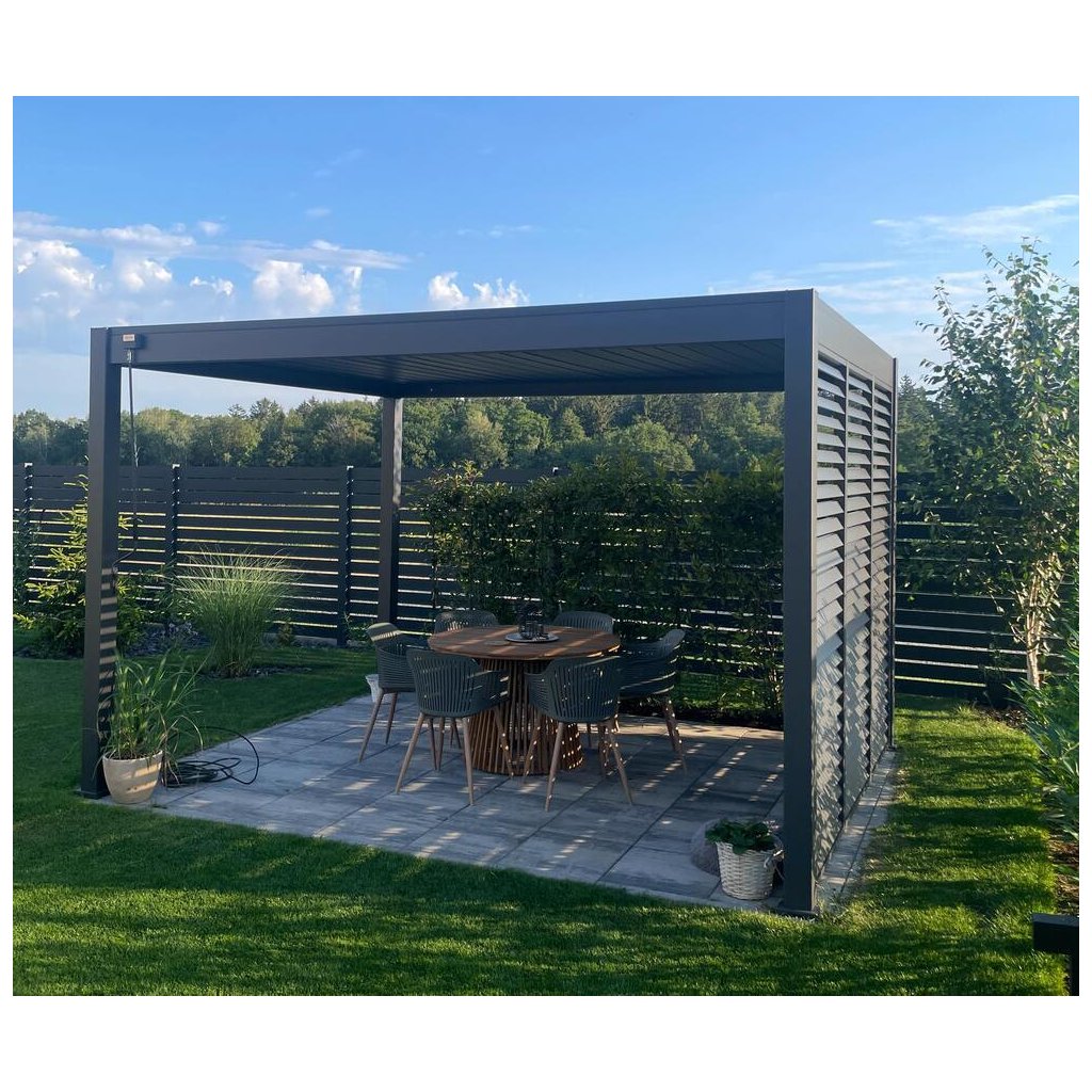 Prémiová voľne stojaca bioklimatická pergola INTRO PLUS v rozmere 4 × 3 m predstavuje ideálne riešenie na ochranu vášho vonkajšieho posedenia. Spája moderný dizajn, vysokú odolnosť a maximálny komfort pri relaxácii na terase či v záhrade. Pevná a stabilná konštrukcia v elegantnej antracitovej farbe RAL 7016 s matnou povrchovou úpravou prirodzene zapadne do akéhokoľvek exteriéru. Vďaka samostatne stojacemu vyhotoveniu nie je potrebné vŕtať do stien, čo vám umožní flexibilne umiestniť pergolu presne podľa vašich potrieb. Celá konštrukcia je vyrobená z kvalitného hliníka s práškovou povrchovou úpravou, ktorá zabezpečuje vysokú odolnosť voči poveternostným vplyvom a dlhú životnosť.