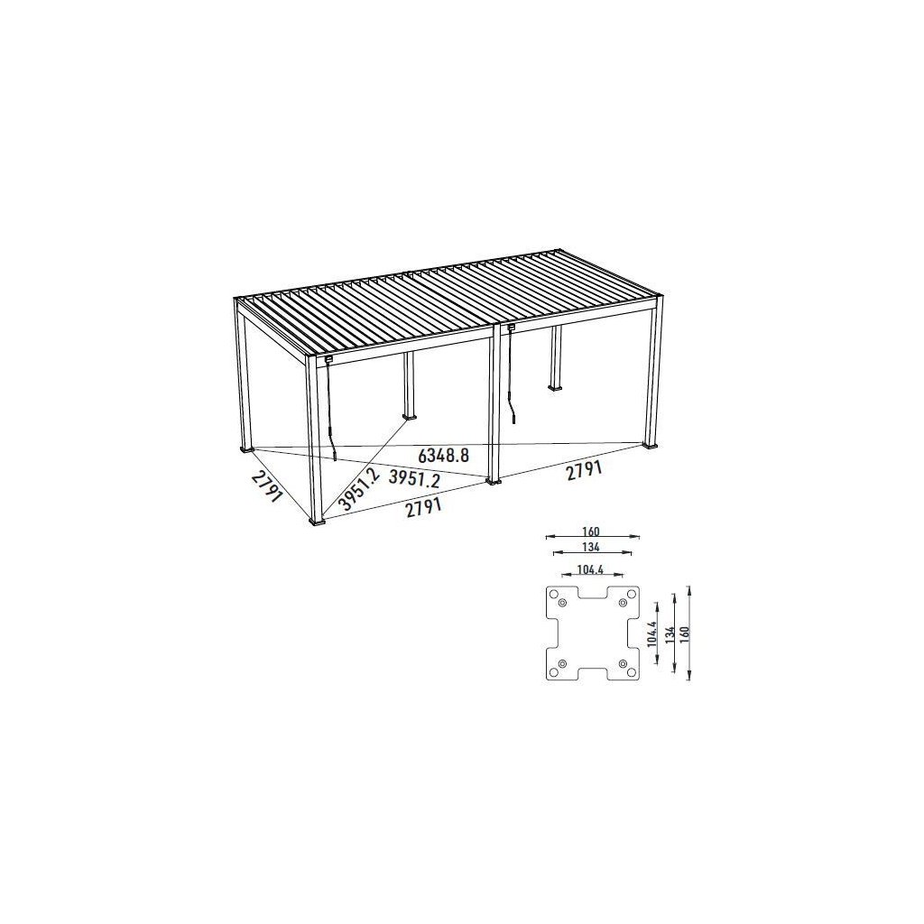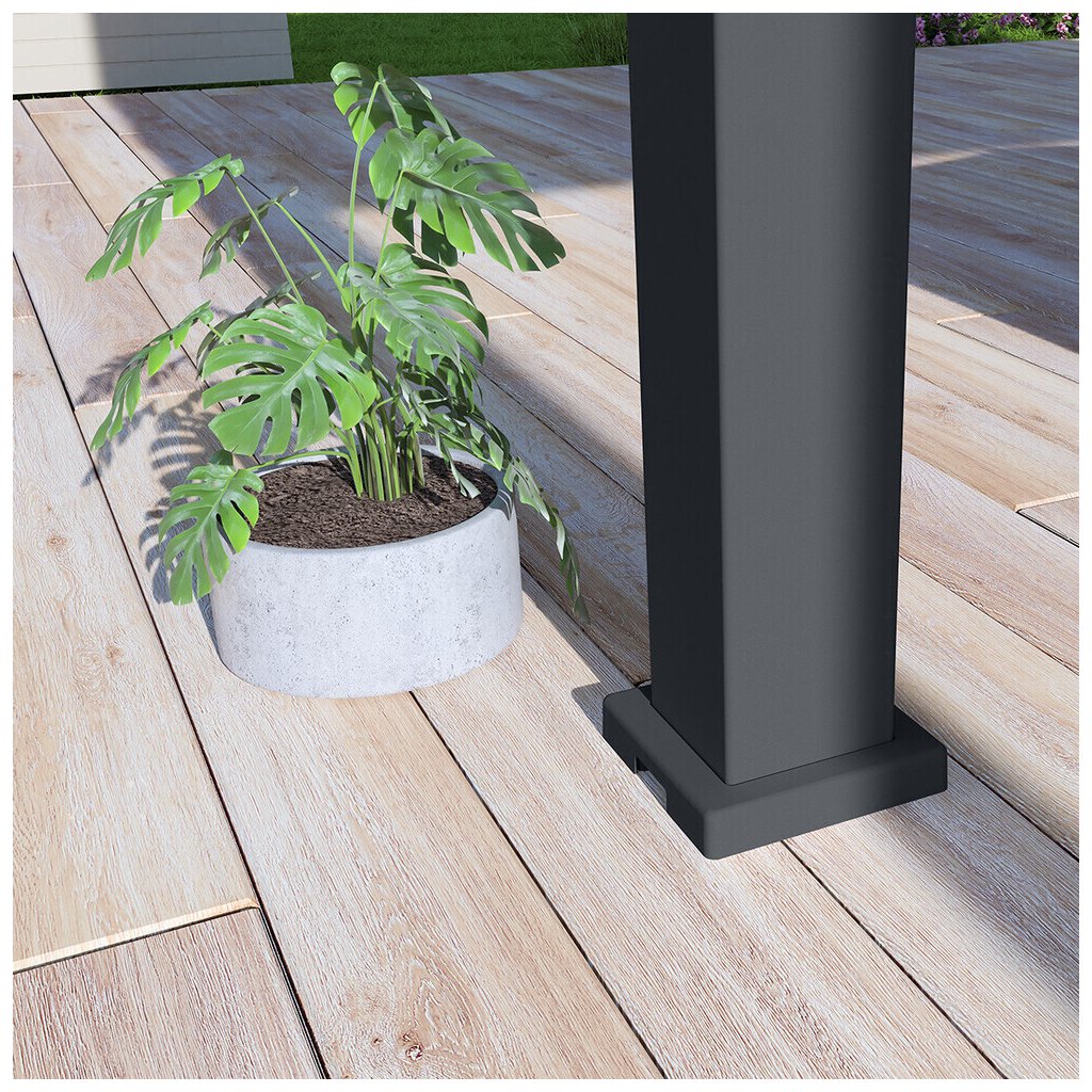 Robustná konštrukcia pergoly zahŕňa stĺpiky s rozmermi 116 × 116 mm a pätky s rozmermi 160 × 160 mm. Pätky sú vyrobené z 8 mm hrubej ocele a prekryté hliníkovým krytom s integrovaným drenážnym systémom. Vyvýšený hliníkový profil s hornou lištou ukrýva lamely tak, že z bočného pohľadu nie sú viditeľné, čím dodáva pergole čistý a moderný vzhľad. V prípade dažďa poskytne spoľahlivý prístrešok, ktorý vás ochráni pred nepriaznivým počasím a zabezpečí pohodlné posedenie aj počas daždivých dní.