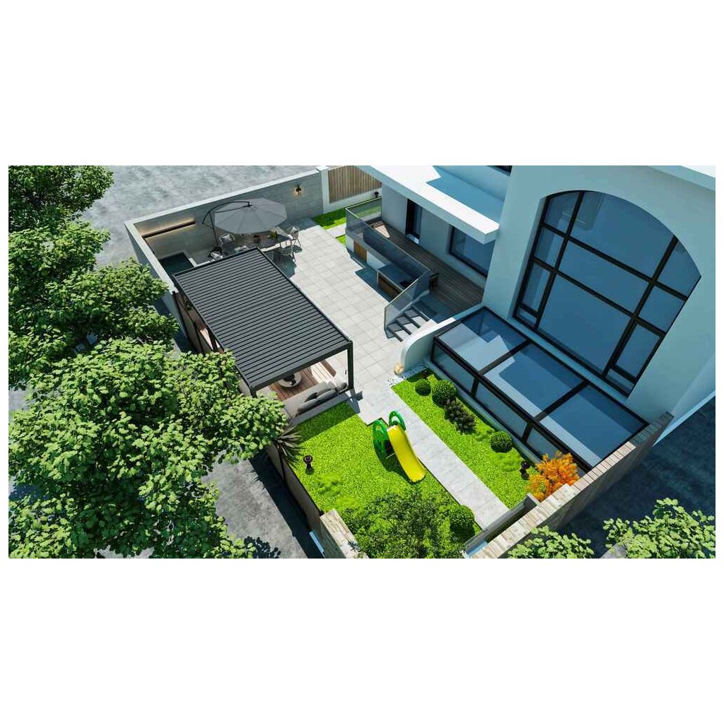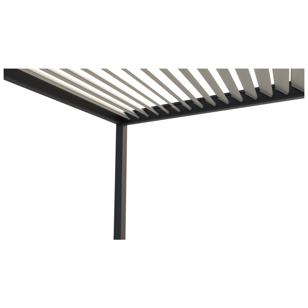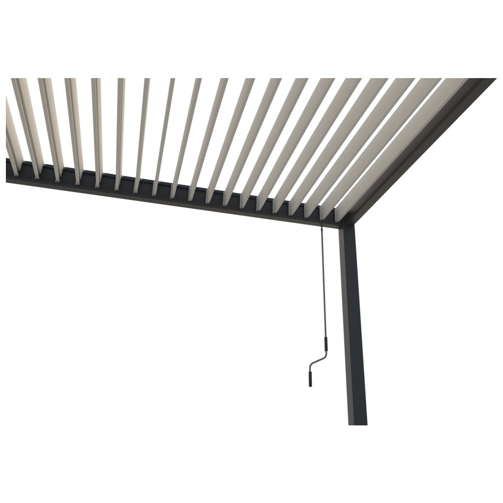 Pergola je vybavená 38 nastaviteľnými otočnými dvojitými lamelami s dutým vnútrom, ktoré poskytujú účinnú ochranu pred slnkom aj dažďom. Ich sklon je možné plynule nastaviť v rozsahu od 0° do 135°, čo umožňuje úplné uzavretie strechy alebo flexibilné prispôsobenie tienenia podľa aktuálnych podmienok. Vďaka tomu získate maximálnu kontrolu nad množstvom svetla a prirodzeným vetraním priestoru. Manuálne ovládanie pomocou kľučky je navrhnuté pre jednoduchú a plynulú manipuláciu bez rizika poškriabania konštrukcie. Kľučka je zároveň umiestnená tak, aby neprekážala pri doplnení pergoly o bočné zásteny či panely, čo umožňuje pohodlné rozšírenie pergoly o ďalšie funkčné prvky.