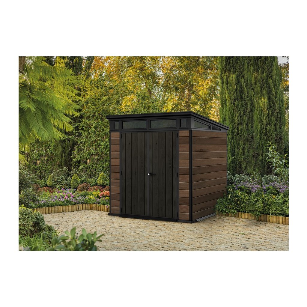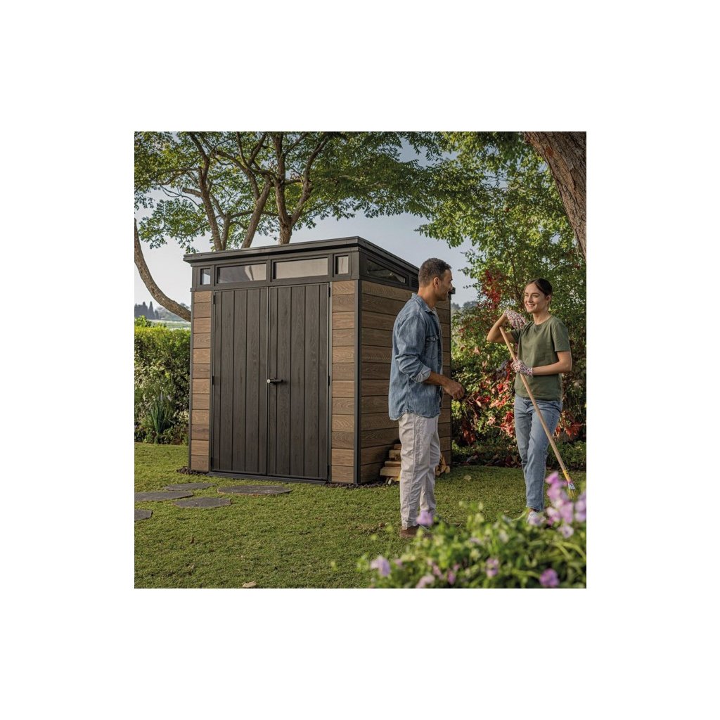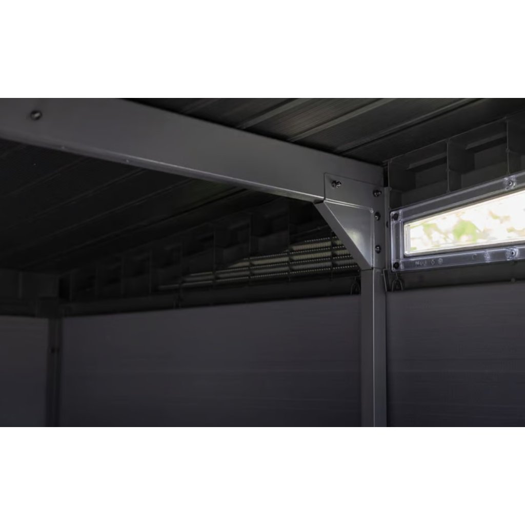 Bezúdržbový záhradný domček CRAMP je skvelou voľbou, ak potrebujete v exteriéri praktický priestor na uskladnenie vecí a chcete mať záhradu vždy upratanú. Bez problémov poslúži na záhradné náradie, kosačku, bicykle aj grilovacie príslušenstvo, ktoré tak budete mať bezpečne uložené a vždy poruke. Pre pohodlné používanie je domček vybavený širokými dvojitými dverami, vďaka ktorým sa dovnútra ľahko dostanete aj s väčšími predmetmi. Stabilitu a komfort pri manipulácii podporuje vysoký a pevný strop spolu s vysoko odolnou podlahou, ktorá je pripravená na každodenné zaťaženie. O dlhú životnosť sa stará pevná strecha a oceľová výstuž, ktoré zvyšujú pevnosť konštrukcie a odolnosť pri používaní v rôznych podmienkach. Domček je možné uzamknúť pomocou 3-bodového uzamykacieho systému, čo prináša vyššiu úroveň bezpečnosti (visiaci zámok nie je súčasťou balenia). Vďaka modernému dizajnu CRAMP prirodzene zapadne do každej záhrady a pôsobí esteticky aj funkčne. Police nie sú súčasťou záhradného domčeka.