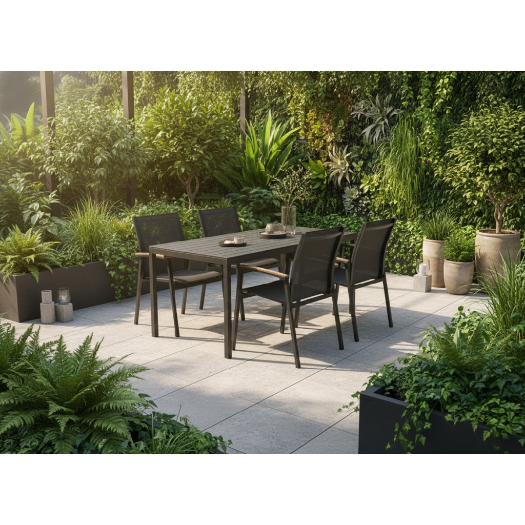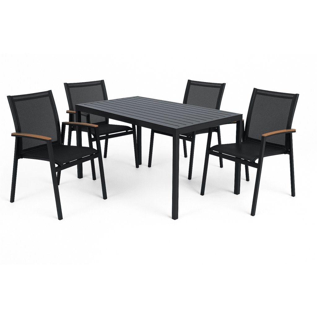 Vneste na svoju terasu či do záhrady spojenie elegancie a praktickosti s moderným vonkajším jedálenským setom JØRGEN. Súčasťou zostavy je stabilný záhradný stôl z kvalitného hliníka a štyri komfortné stoličky s pevnou konštrukciou, priedušným textilným sedadlom a podrúčkami s jemným dreveným akcentom. Kombinácia čiernej farby a dreva pôsobí súčasne moderne aj prirodzene a ľahko zapadne do akéhokoľvek exteriéru. Set je ideálnou voľbou pre rodinné stolovanie, príjemné stretnutia s priateľmi aj pokojné chvíle oddychu pod holým nebom. Ľahká, no robustná hliníková konštrukcia zaručuje dlhú životnosť a vysokú odolnosť voči nepriaznivému počasiu.