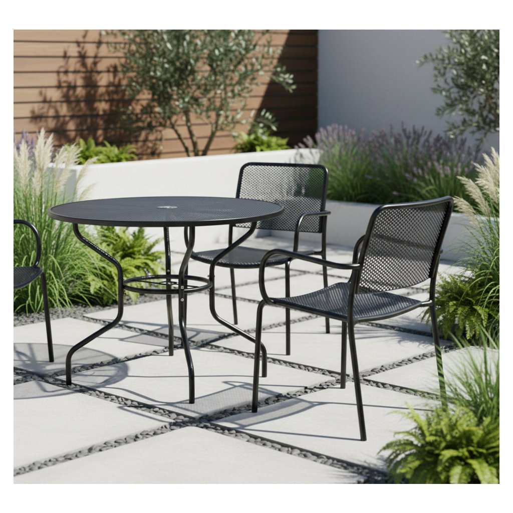 Vytvorte si útulné miesto na oddych alebo stolovanie pod holým nebom s okrúhlym záhradným stolom ZION v elegantnom čiernom prevedení. Praktický otvor na slnečník prináša ideálne spojenie štýlu a funkčnosti pre každé vonkajšie posedenie. Vďaka modernému dizajnu sa stôl prirodzene začlení do rôznych typov exteriérov – od minimalistických terás až po klasické záhrady. Otvor na slnečník z neho robí skvelú voľbu na rodinné obedy, stretnutia s priateľmi aj pokojné popoludnia v príjemnom tieni. Kvalitné spracovanie zabezpečuje vysokú odolnosť voči korózii aj nepriaznivým poveternostným podmienkam.