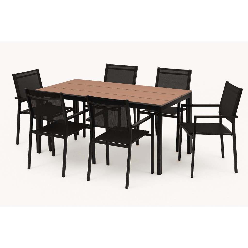 Hliníková konštrukcia záhradného stola je ľahká a odolná voči poveternostným podmienkam. Vrchná doska stola je vyrobená z materiálu artwood pripomínajúci drevo, je však z plastu. Ratanový materiál záhradnej stoličky odoláva slnku, dažďu a vetru, čím zabezpečuje dlhodobú krásu a funkčnosť. Oceľová konštrukcia s práškovým nástrekom zaručuje vynikajúcu pevnosť a stabilitu. Oceľ je odolná voči mechanickému poškodeniu a dlhodobo vydrží aj vo vonkajších podmienkach. Sedacia a opieracia časť je vyrobená z priedušného materiálu, ktorý rýchlo schne a poskytuje maximálne pohodlie.