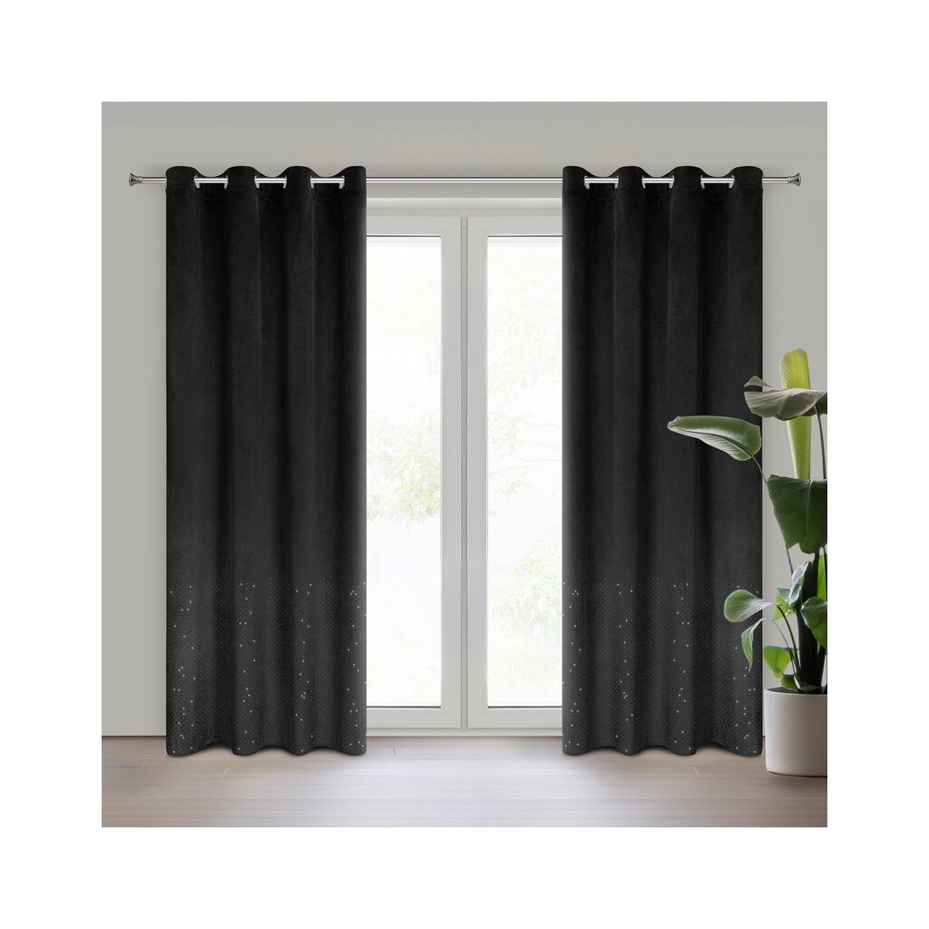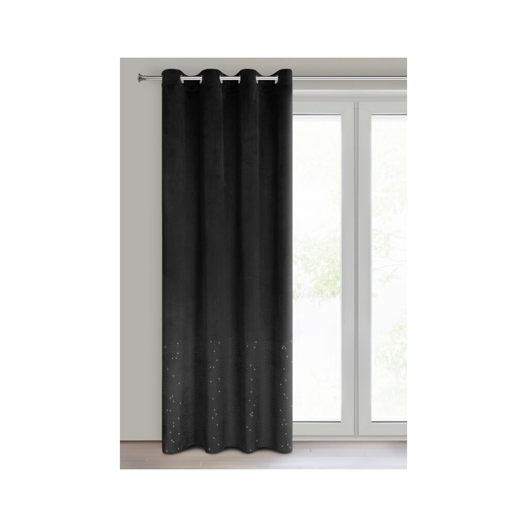 Dodajte svojmu interiéru luxusný nádych so štýlovým zamatovým závesom ARIADNA K zdobeným trblietavými diamantmi. Tento hotový záves v elegantnej čiernej farbe sa stane výrazným doplnkom každej miestnosti – od spálne až po modernú obývačku. Čierny zamatový záves s diamantmi vytvorí v miestnosti sofistikovanú a útulnú atmosféru. Spája eleganciu, funkčnosť a glamour vzhľad, vďaka ktorému bude váš domov pôsobiť výnimočne.